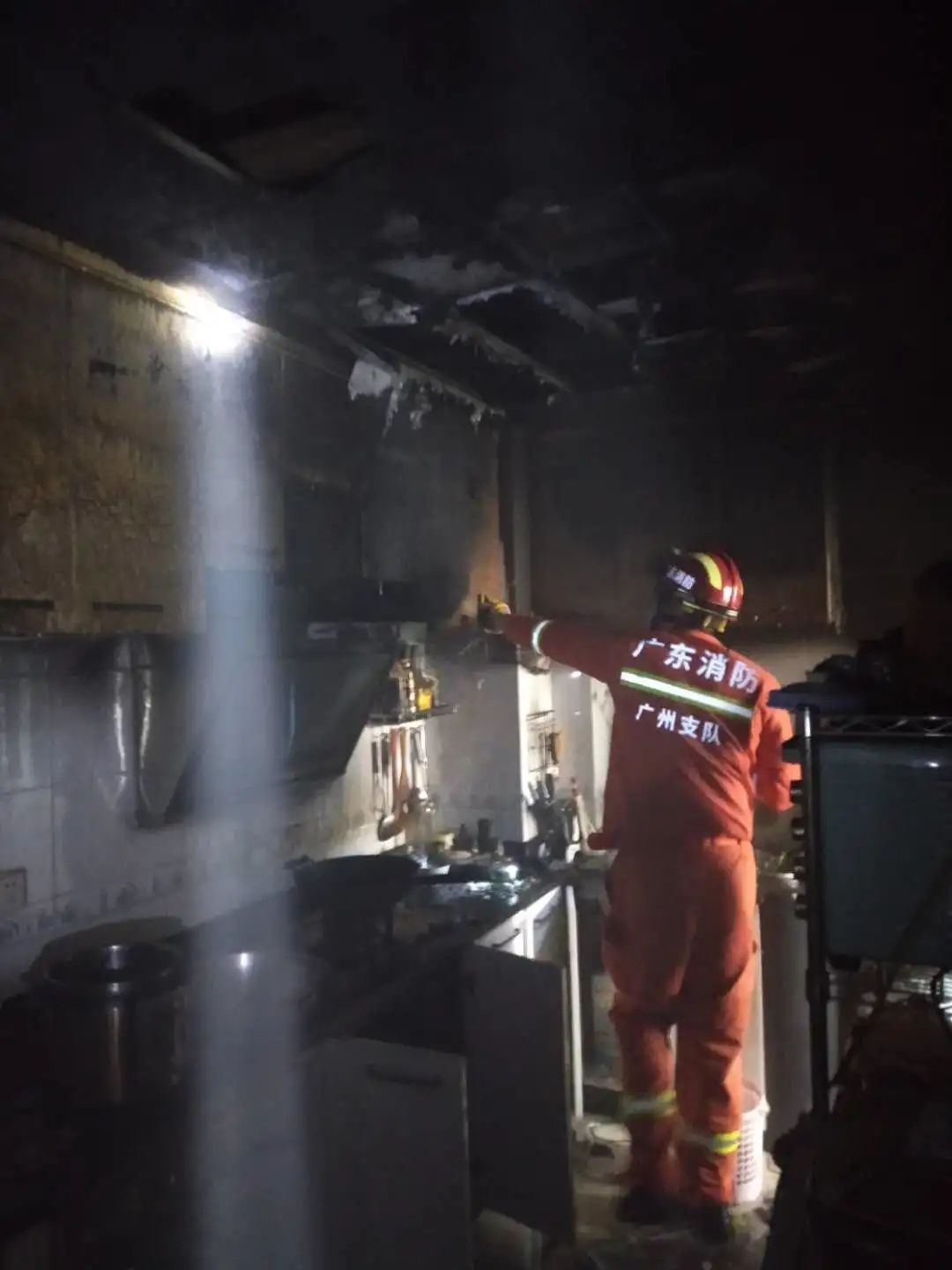 休息了一小会儿,终于缓过来的曾展明担心还有没被扑灭明火,又马上回到家里翻出一个手电筒,重新进入邻居厨房检查是否还有明火,确认已经没有危险,才安心地退出来休息。
