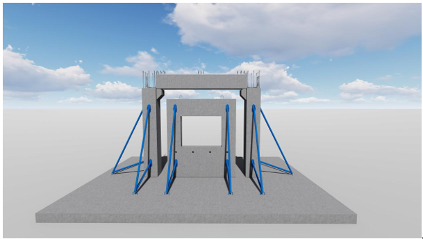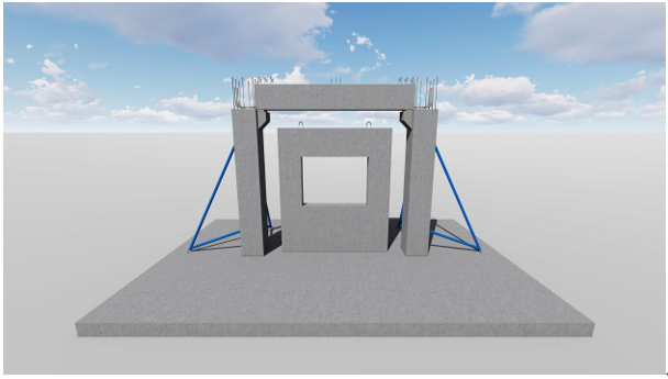 赛前一根预制柱已安装固定,并在上面划好1米标高控制线,竞赛时参赛团队用塔式起重机将另一根预制柱、预制墙板、预制梁从堆场起吊,在工位上安装。预制柱通过钢筋套筒连接方式安装,辅以斜支撑稳定;预制墙板通过钢筋螺纹盲孔连接,辅以斜支撑稳定;预制梁安装在两根预制柱的牛腿上。参赛团队应自行划好各预制构件的边线控制线,以便对位安装。