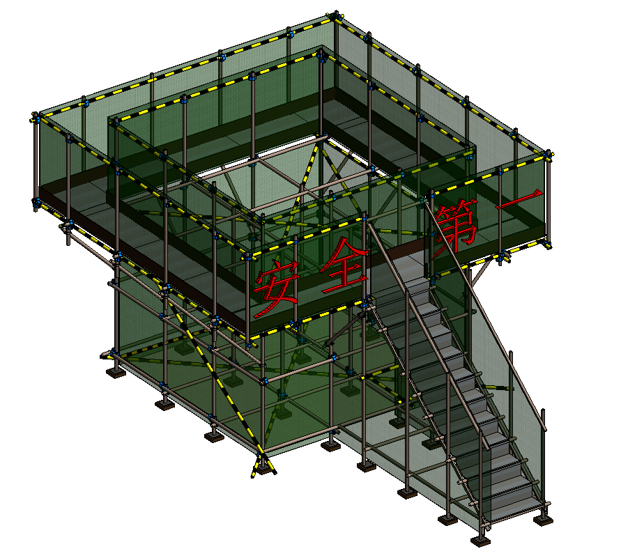 如图所示,本题是带悬挑通道的扣件式钢管满堂脚手架,要求在规定时间内完成包括架体、悬挑人行通道、人行爬梯、栏杆、脚手板、封网等架设工作。钢管、扣件、脚手板等构配件由擂台赛组委会统一提供。