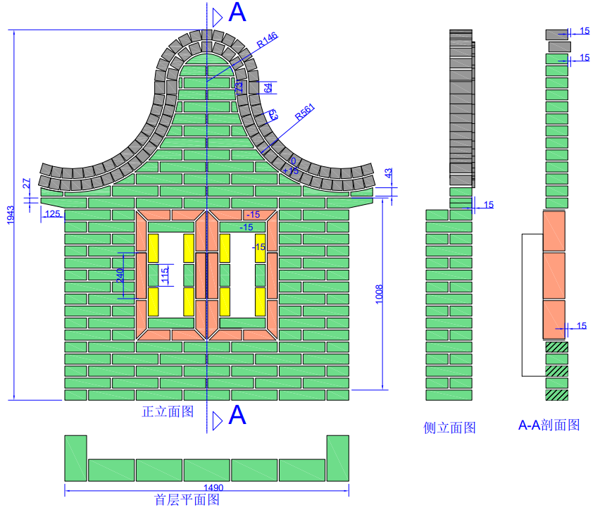 试题为“岭南特色建筑120mm厚清水墙”。墙长1490mm,墙高1943mm,墙厚120mm。“满洲窗”为凹面造型,“窗檐”为凸面造型。作品背面不勾缝,正面和侧面勾半圆缝。