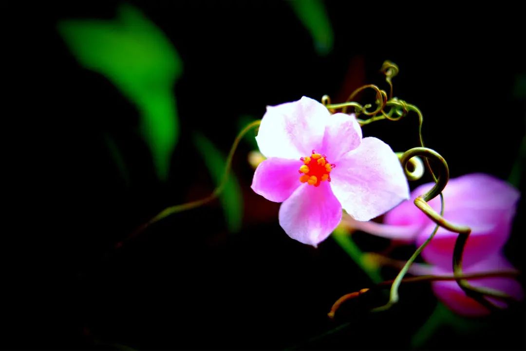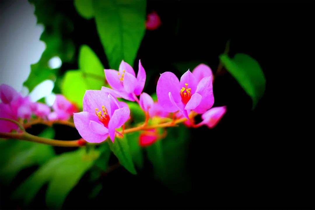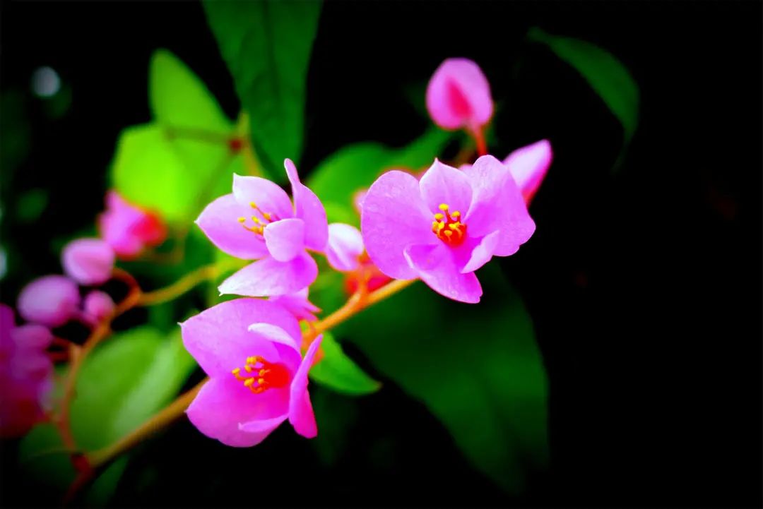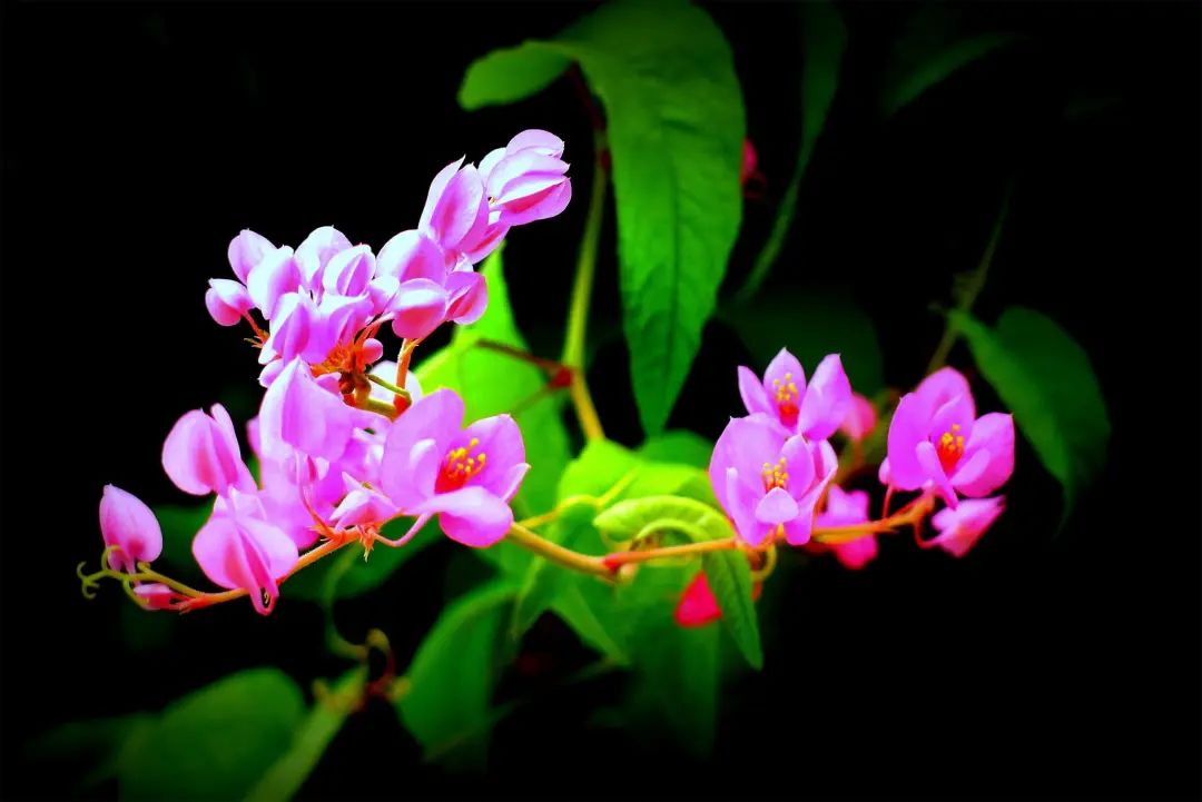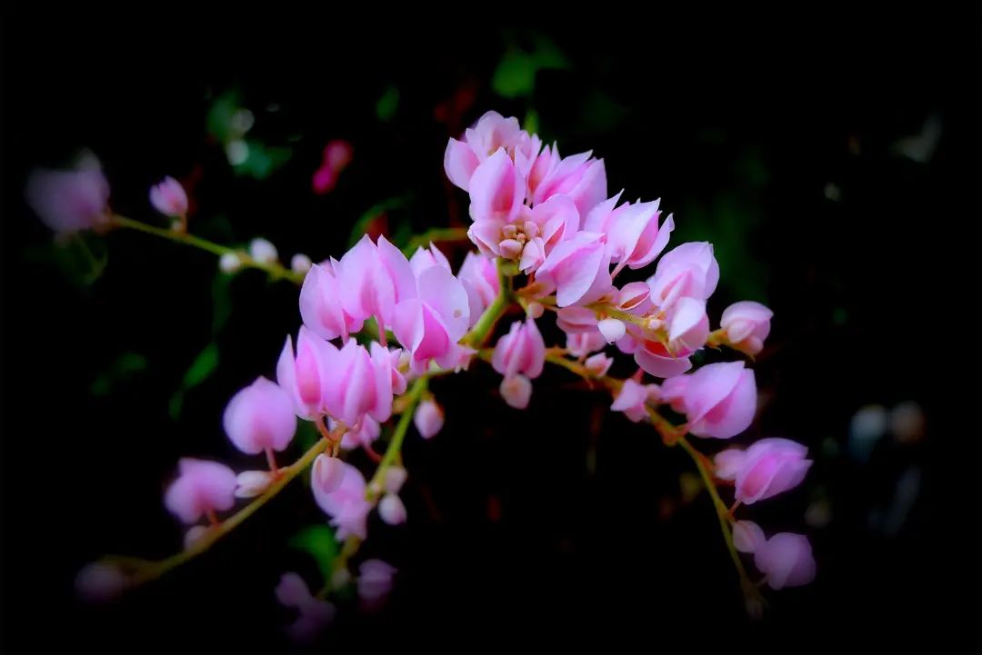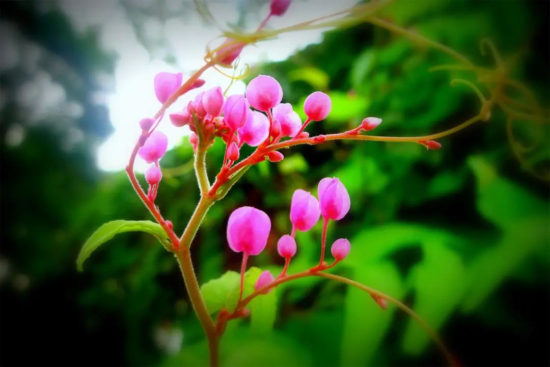那是下旬,在凉亭左边的亭角,粉红色的花,在卷须状的藤蔓上,开得密生成串。细看每一朵,很小,像小灯笼,皆由五个似花瓣的苞片组成,像冒出了一片片密密麻麻的红珊瑚来了。珊瑚藤这个花名,就是因粉红色苞片组成的花朵颇似珊瑚而得名,还有个别名“红珊瑚”。