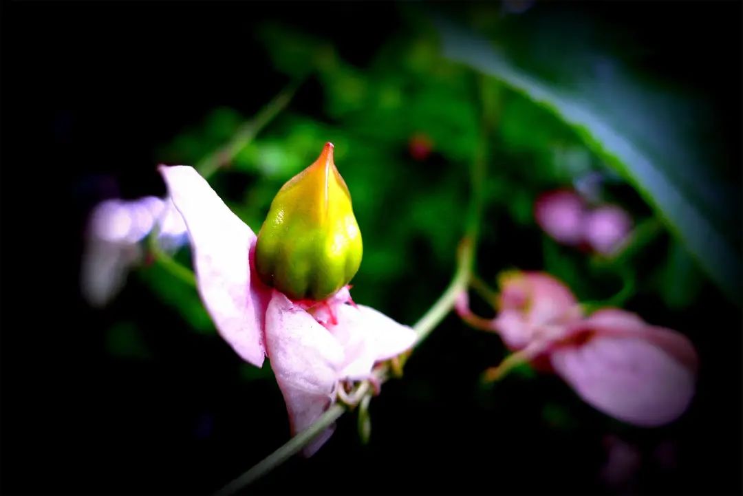 如今因为一场雨,这藤蔓植物迅速地攫住了我的眼球。等雨变小,我绕着小凉亭转了一圈,看到亭子上的藤蔓,卷须状的藤曼上,零零星星地开着一串串细小的花穗,哦,原来是珊瑚藤开始挂起了几朵粉红色的花。