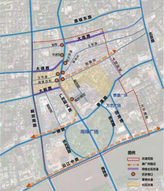 主要改造空间包括:1个城市客厅-海珠广场,优化广场交通组织,提升广场空间品质,引入市民活动和驻留观赏,打造城市客厅。2条最广州路径(珠水丝路径、街市揽胜径),打造“最广州”历史文化步行主题街,串联最能体现“海丝风情”和“广州味道”的文化资源,未来街坊和游客可沿着这些路径“品读广州”。