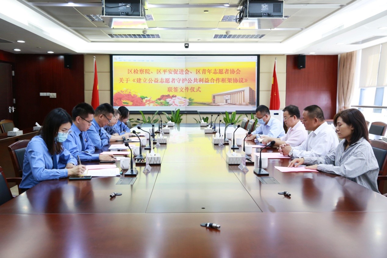 2020年10月22日上午,广州市黄埔区人民检察院与广州市黄埔区平安促进会、广州市黄埔区青年志愿者协会共同签订《关于建立公益志愿者守护公共利益合作框架协议》。中共广州市黄埔区委政法委员会等单位的有关领导受邀出席联签仪式。