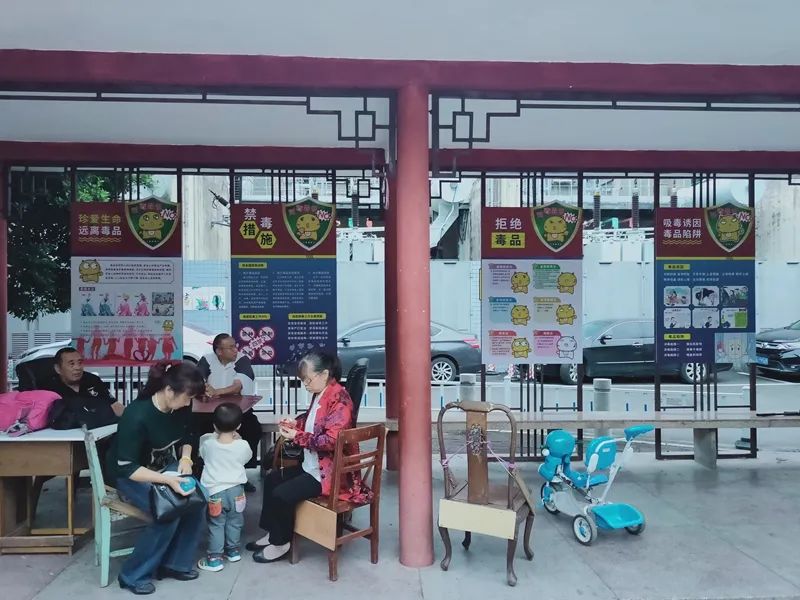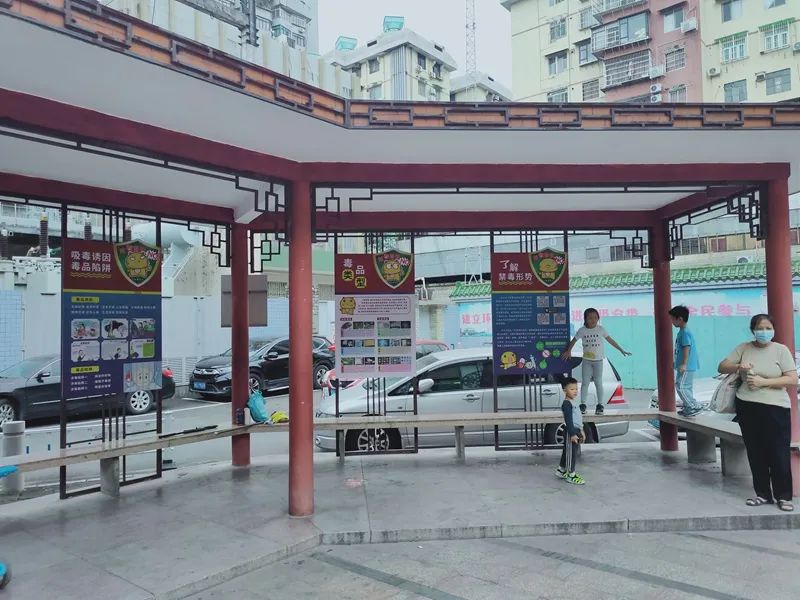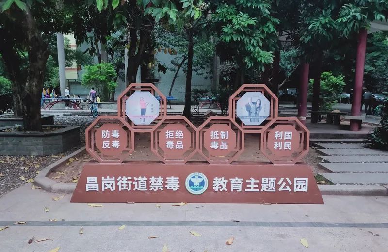 在昌岗街道禁毒主题公园内,文化长廊、休闲亭等景观都巧妙地融入了禁毒元素,有效地把毒品危害、禁毒法律法规等禁毒知识作为文化基因注入公园整体设计布局中,让广大群众在休闲娱乐、享受文化景观的同时,提升识毒防毒拒毒能力,营造全民抵制毒品、参与禁毒的社会氛围。