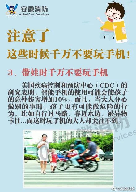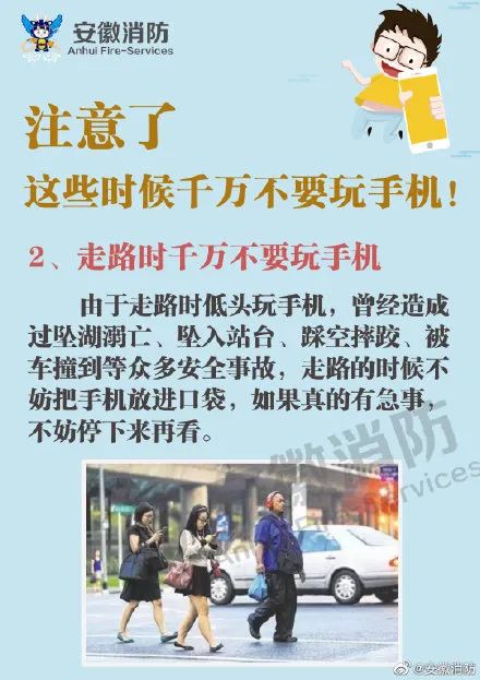 吃饭不离手 睡觉不离手 走路也不离手 这就是现在许多人 与手机的相处方式 最近,安徽合肥 教训惨痛的一幕发生了 10月17日 合肥地铁3号线图书馆站内 一名女子下楼梯时玩手机 不小心一脚踩空 随后踉跄几步 从20多级台阶重重地摔到地面上 脸部受伤严重 附近路过的乘客 急忙上前帮忙 地铁工作人员随即也及时赶到 对女子进行前期伤口处理 同时拨打了120 随后,女子被紧急送往医院救治 网友: “看着都疼!” “走路真的要小心一点” 不分场合玩手机 到底有多危险? 近年来 各地出现无数惨痛案例 2019年3月,福建 一名女司机张某 以120公里巡航定速 在高速路隧道中发生意外 撞上隧道壁当场身亡 警察从她的手机记录中发现 她在驾车的34分钟里 用手机发信息、接打电话共计30次 2018年7月,新疆克拉玛依 一小伙走路玩手机摔下4米深井 右腿骨折 消防员赶来救援时 男子一边疼得呻吟 一边还在玩手机 2019年12月,贵州 一名装修工人 边玩手机边上电梯 电梯门开了但电梯却没到 他一脚踩空掉进电梯井里 幸好他及时抓住钢索 救援人员发现他时 他已经从30楼顺着钢索滑坠至8楼 2015年12月 温州一名年轻女子 因专注看手机 一脚踩空摔入河内 挣扎了几十秒后 最终渐渐沉入河底 不幸身亡 随时随地玩手机 不仅置自己的生命安全于不顾 还往往给身边的人 带来难以预估的伤害 ↓↓↓ 今年10月2日,广西南宁东站 一名2岁的小朋友在车站走丢 家长说,候车时几个大人 都以为孩子有其他大人照看 便放松了警惕 各自低头专心玩手机 幸运的是 家长报警后孩子被找回 2019年4月13日,杭州 男子纪某因路上车辆稀少 且觉得开车无聊 就放慢车速 掏出手机玩起一款闯关游戏 途中车辆突然撞上在路边散步的 一名68岁的老太 致其当场死亡 “如果换做自己 看手机时一定能兼顾看路 危险来临时 也一定能及时‘刹住车’” 这是许多人都有过的想法 然而越来越多的事故 为我们敲响警钟 ▽滑动查看,这些时候千万不要玩手机!▽ 看手机,要分清场合地点 别拿自己和别人的生命当儿戏
