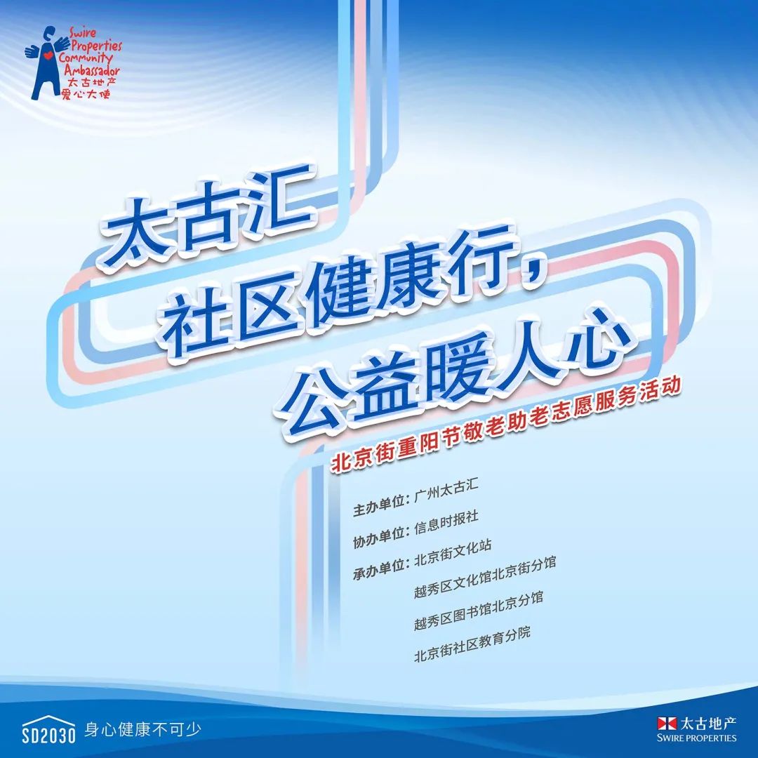 为增强老年人对健康知识的了解,同时激发老年人关爱自己、关爱健康的自我保健意识,10月24日(本周六)上午10:00,广州太古汇携手《信息时报》举办“太古汇社区健康行 公益暖人心”活动,为北京街的中老年群体提供健康知识教育。