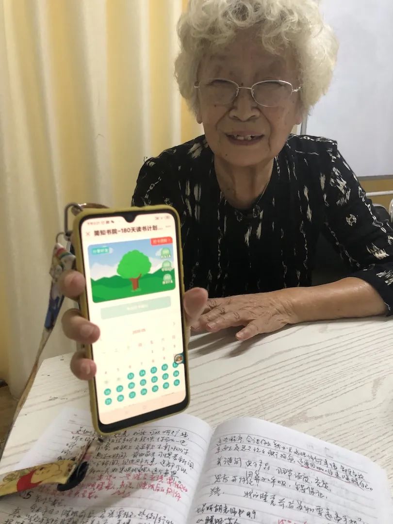 严婆婆给小e展示她的每天读书打卡及心理学习笔记