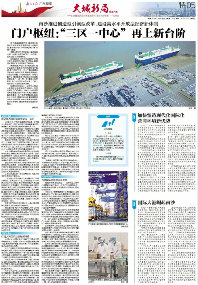 南沙正全力打造高水平对外开放门户枢纽,奋力开创“三区一中心”(高标准建设国家新区、自贸试验区、粤港澳全面合作示范区和承载门户枢纽功能的广州城市副中心)建设新局面。