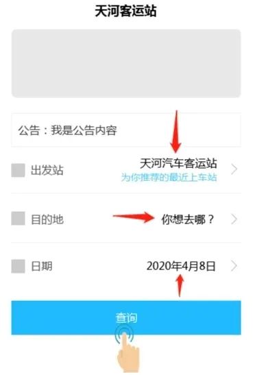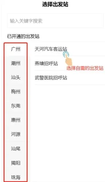 选择就近的出发站点,如需要去的目的地的没有直达班车,系统会根据你需要去的站点,为您推荐中转方案。