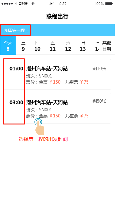 3、选择第一程出发时间班次