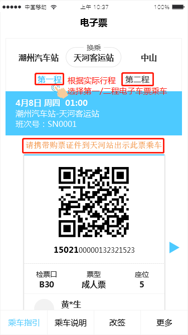 第一程:直接凭电子票到当地的车站的检票口乘坐到天河客运站的班车即可;