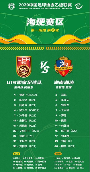 今天下午,第一阶段首轮进行第二比赛日角逐,U19国青首度亮相,对阵实力中下的湖南湘涛队。去年中乙联赛,湖南湘涛在排位赛第三轮最后时刻才通过点球大战艰难保级。