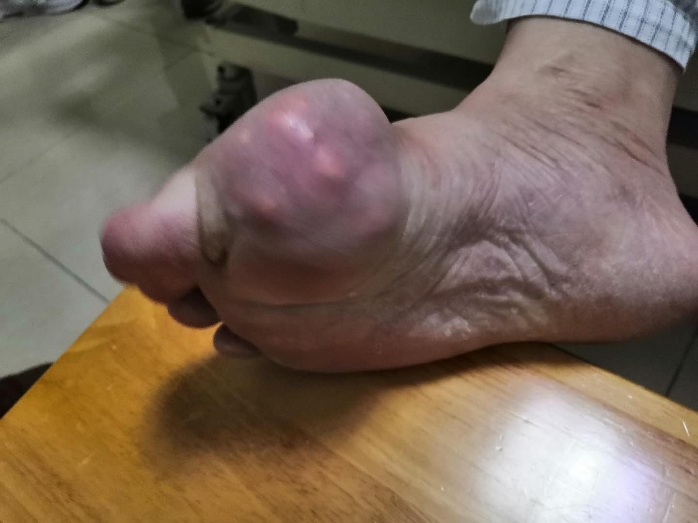 前段时间,李先生的脚愈加疼痛难忍,唯一能穿的鞋子也快穿不进去了。痛风石过大,表面的皮肤也越来越薄,里面的“石头”清晰可见,李先生才下定决心来手术。