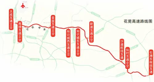 花莞高速黄埔段共设3个出入口(收费站),1座互通立交,均在知识城范围:知识城东、知识城西、新龙。花莞高速金盆至仙村立交段正式通车后,黄埔街坊驾车从知识城到白云机场,最快仅需15分钟!