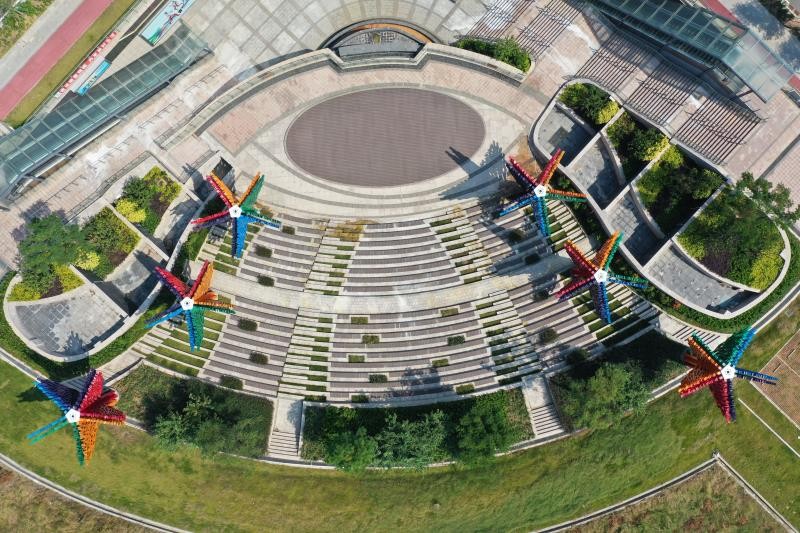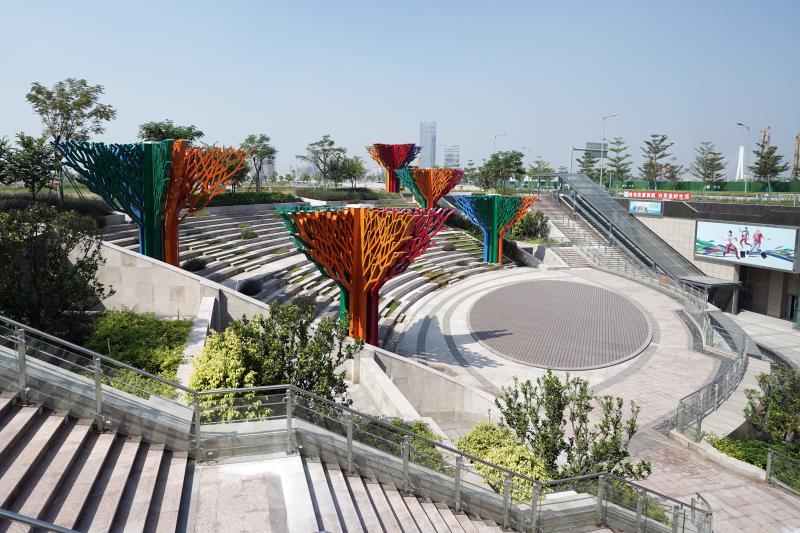 作为地下空间主入口的形象展示面,位于公共绿地的下沉广场兼具交通和娱乐功能,采用将花园融入地下商业空间模式,打造尺度宜人、自然舒适的地下空间环境。下沉广场总体面积约1900平方米,与地面高差约10米,营造出连续开放、上下一体的城市立体公共空间。