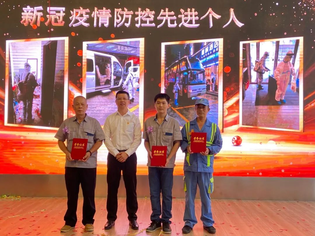 另一边,活动现场,石围塘街党工委书记麦韶明、石围塘街道办事处主任郭军勉上台为荣获街道新冠疫情防控先进个人以及三防应急抢险先进个人的环卫工人们颁发荣誉证书。在颁奖的过程中,石围塘街还在现场连线了一名仍在隔离酒店工作的环卫工人,“隔空”为他送上了节日的祝福。除了颁奖,石围塘街全体环卫工人还一同合唱了属于他们的环卫工人之歌——《是你》。“每一年环卫工人节,街道都会为了我们举办活动,给我们送上慰问。对我们而言,这所有都让我们很感动,也很感激街道。”一环卫工人说到。
