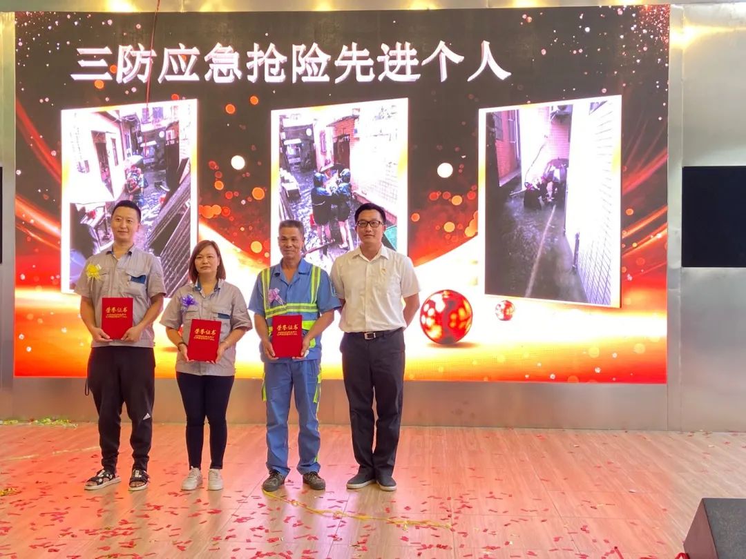 石围塘街道办事处主任郭军勉(右一)为获得三防应急抢险先进个人的环卫工人颁发证书。