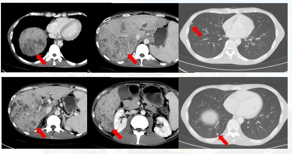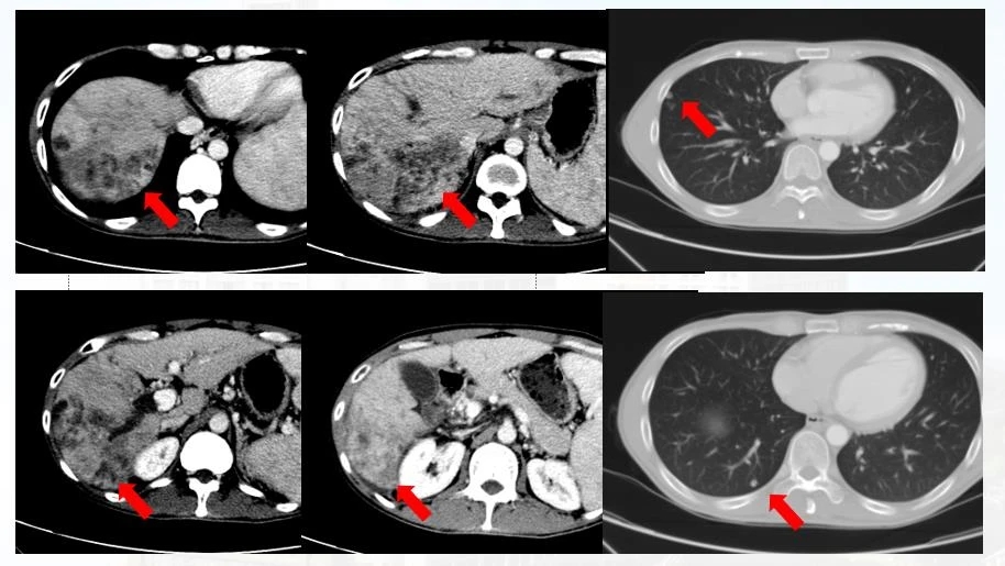 HAIC PD-1抗体动脉灌注 靶向治疗,第一个疗程后复查CT见上图( 2020-05-12 ),肝内及肺内病灶较前明显缩小。