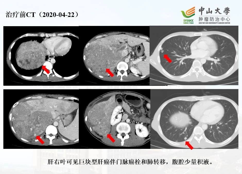 第四个疗程后复查CT( 2020-08-4,见上图 ),肝内肿物较前明显缩小、减少,门脉癌栓范围较前缩小,肺内病灶较前进一步缩小。