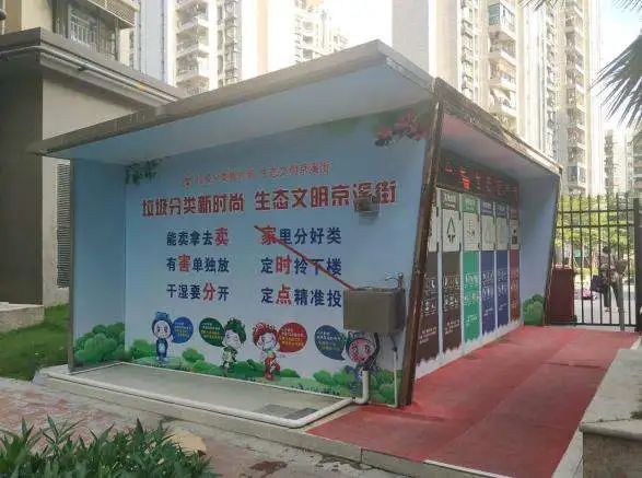 海南干休所是京溪街代表性军区直属单位,具有特殊的教育示范意义。驿站上方张贴广告板,营造垃圾分类宣传氛围;收集房左侧新增洗手台,配备清洁用品,减少细菌传播风险。