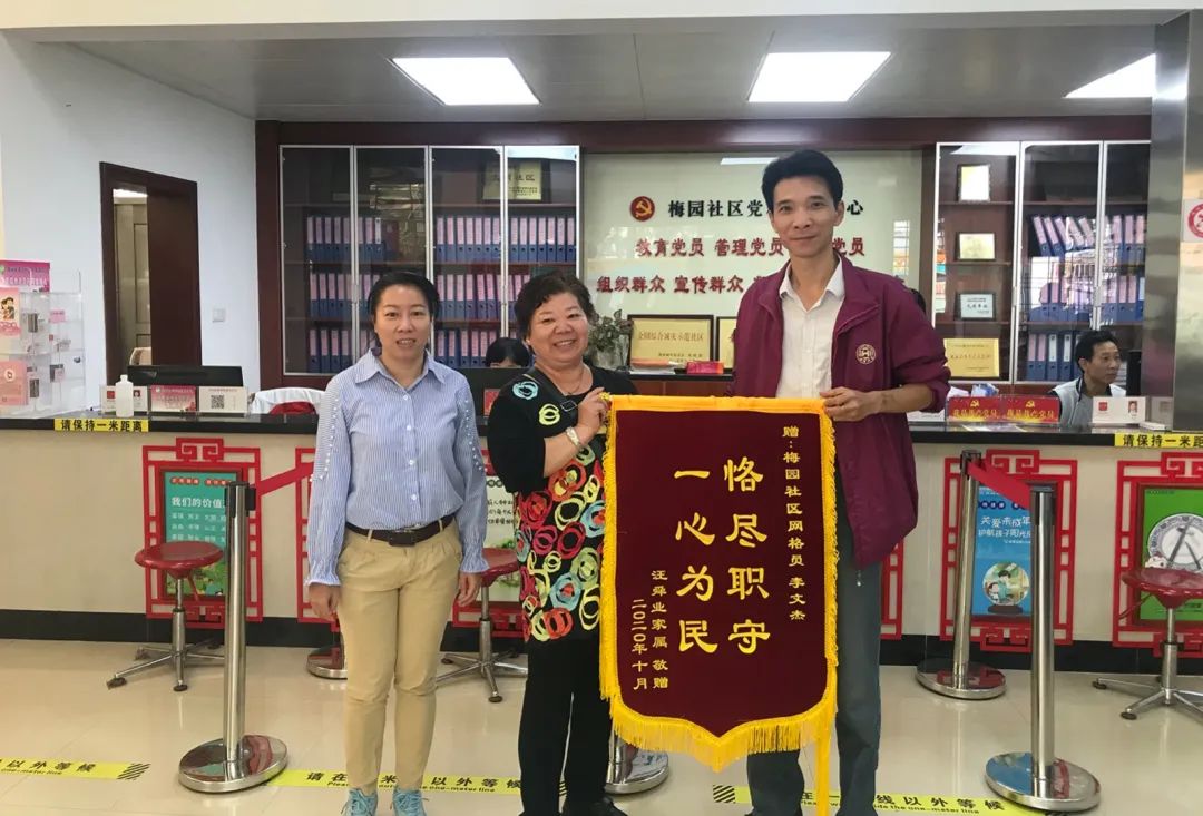 10月26日,汪老伯家属汪女士将印有“恪尽职守 一心为民”的锦旗亲自送到长洲街网格员李文杰手中,对网格员见义勇为、热心助人的行为表达真挚的感谢。