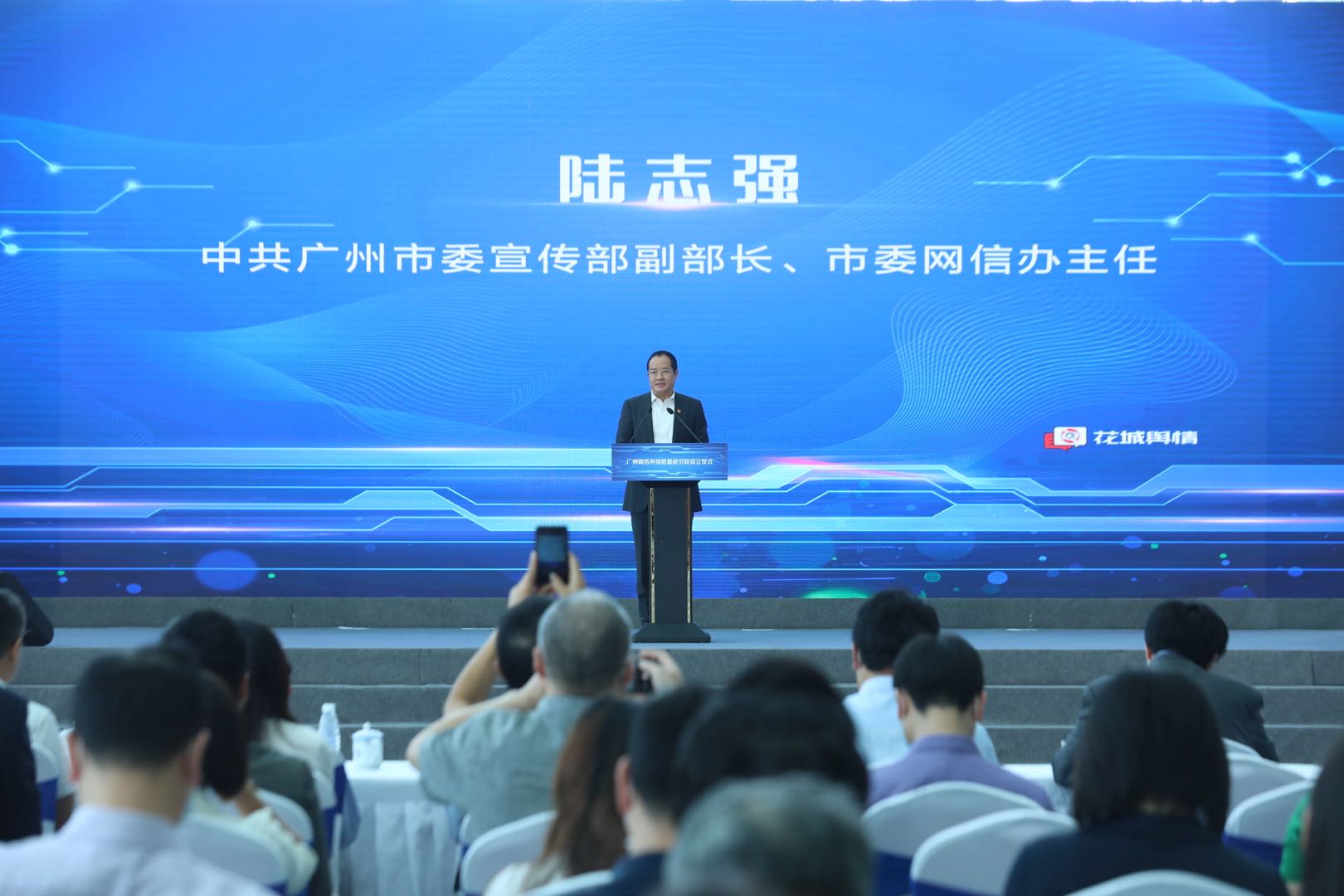 陆志强主任对研究院的成立表示热烈祝贺,他指出,研究院的成立贯彻落实习近平总书记对媒体融合作出的重要指示,是落实中共中央办公厅、国务院办公厅印发了《关于加快推进媒体深度融合发展意见》相关要求的一次重要探索,也是创新舆论引导和舆情应对处置工作机制的一项重要举措。希望研究院充分发挥聚合媒体、数据和系统分析等优势,助力羊城提升新时代舆论引导能力;各部门、各区借鉴舆论引导和应对优秀案例的做法,为我市“四个出新出彩”工作保驾护航。