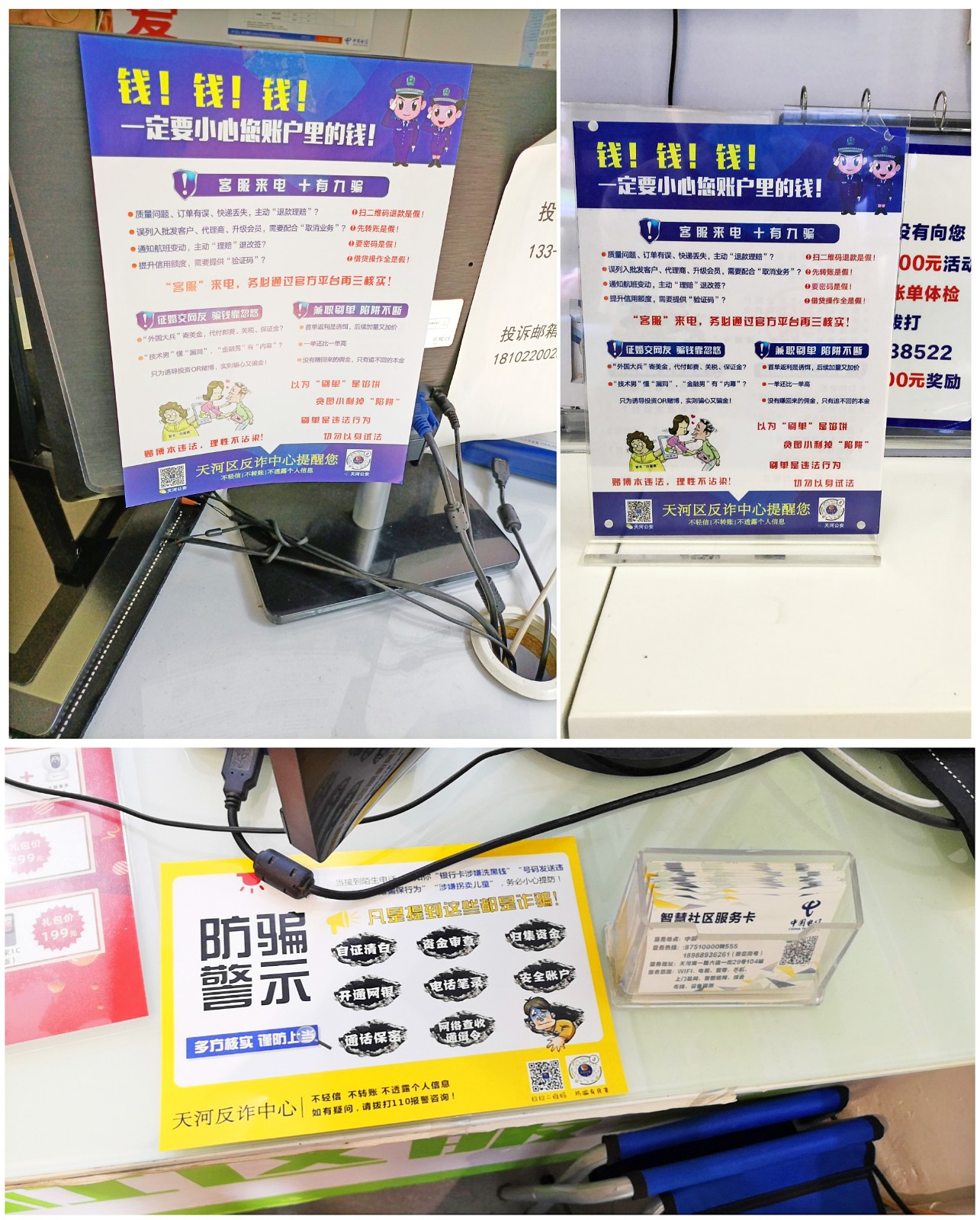 广州天河警方联合中国电信公司广州天河分公司,利用群众办理、了解电信业务的时机,在天河区15家营业厅、38家社区店、94家社零网点开展全民反诈宣传,通过在电信营业厅张贴宣传海报、在产品宣传栏放置防诈骗宣传单张、在收银台张贴防诈骗提示等方式,进一步扩大反诈宣传覆盖面。目前,共张贴海报50张、印制防诈骗宣传单张500张、张贴防诈骗提示卡500张。