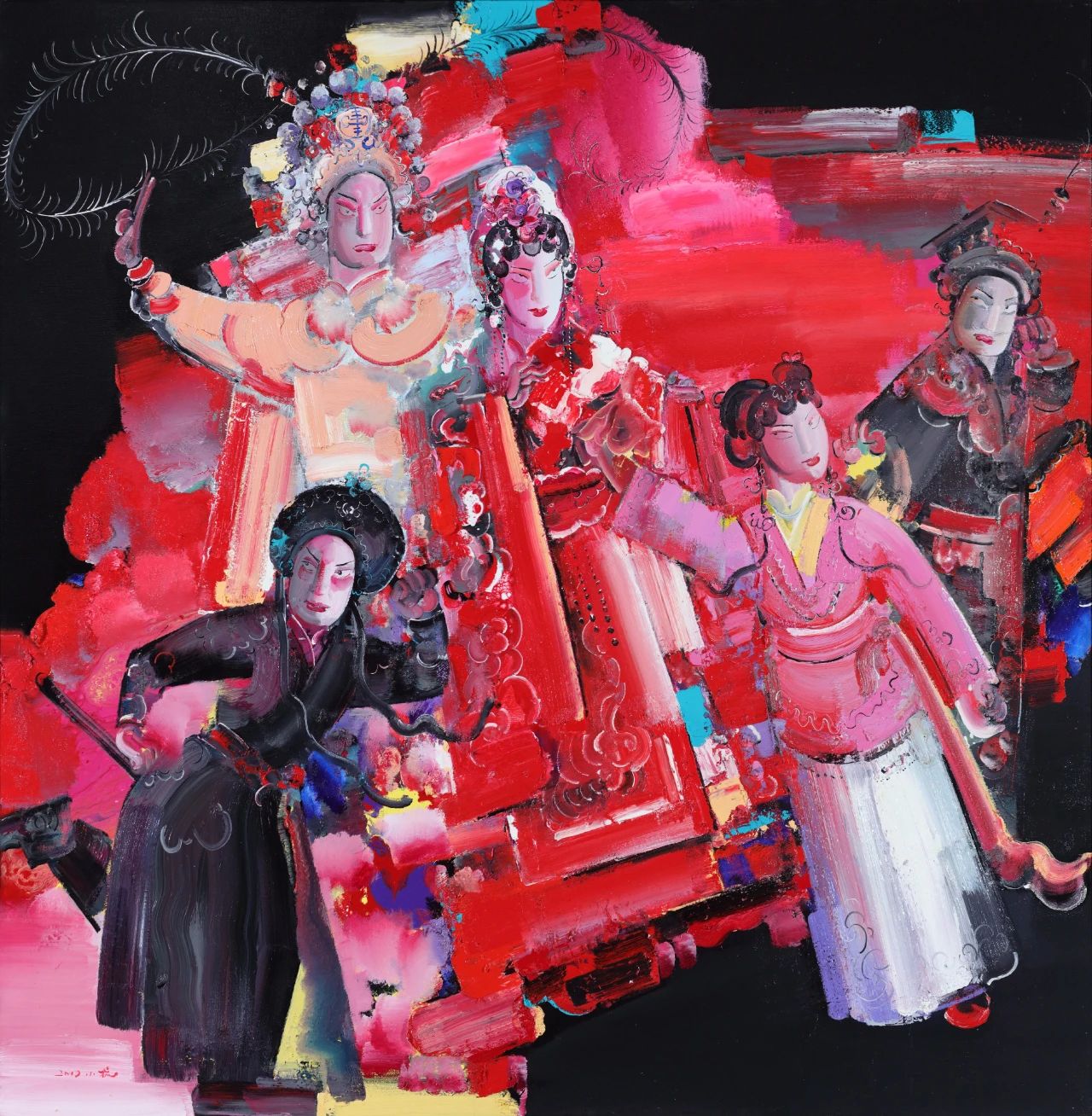 戏曲元素是彭小杭作品中的重要元素和组成部分之一,他从小就对戏剧耳濡目染,对于他来说,戏剧是东方文化的缩影,渗透着民族的生命力,蕴含了东方思想和人文情怀,这些也激发了他对于生活的思考,促使他用绘画创作来抒发对于戏剧的热爱。在他的作品中,角色造型简洁,外表简化,也不再注重戏剧中角色造型的一板一式,而讲究角色的持续性,强调角色在时空中的永恒感,用泼墨来描绘时间残片,增加时代的不确定感,使得从角色可以联想到古代、现代、当代。。