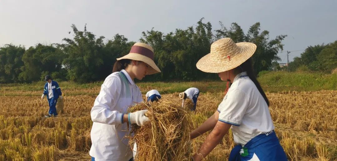 在稻田上,只见华附学生穿着校服,戴着草帽,有说有笑。他们弯着腰,一手抓住稻谷,一手用镰刀割下,再起身把割好的水稻放到田边的空地上,动作颇为娴熟。“身边不少同学都是第一次拿起劳作的工具,割稻穗、收豆子,很新鲜,非常珍惜这次宝贵的学农机会。”高二6班学生薛海滢说,“学农让我们进步,劳动让我们成长,只有立地才能顶天”。