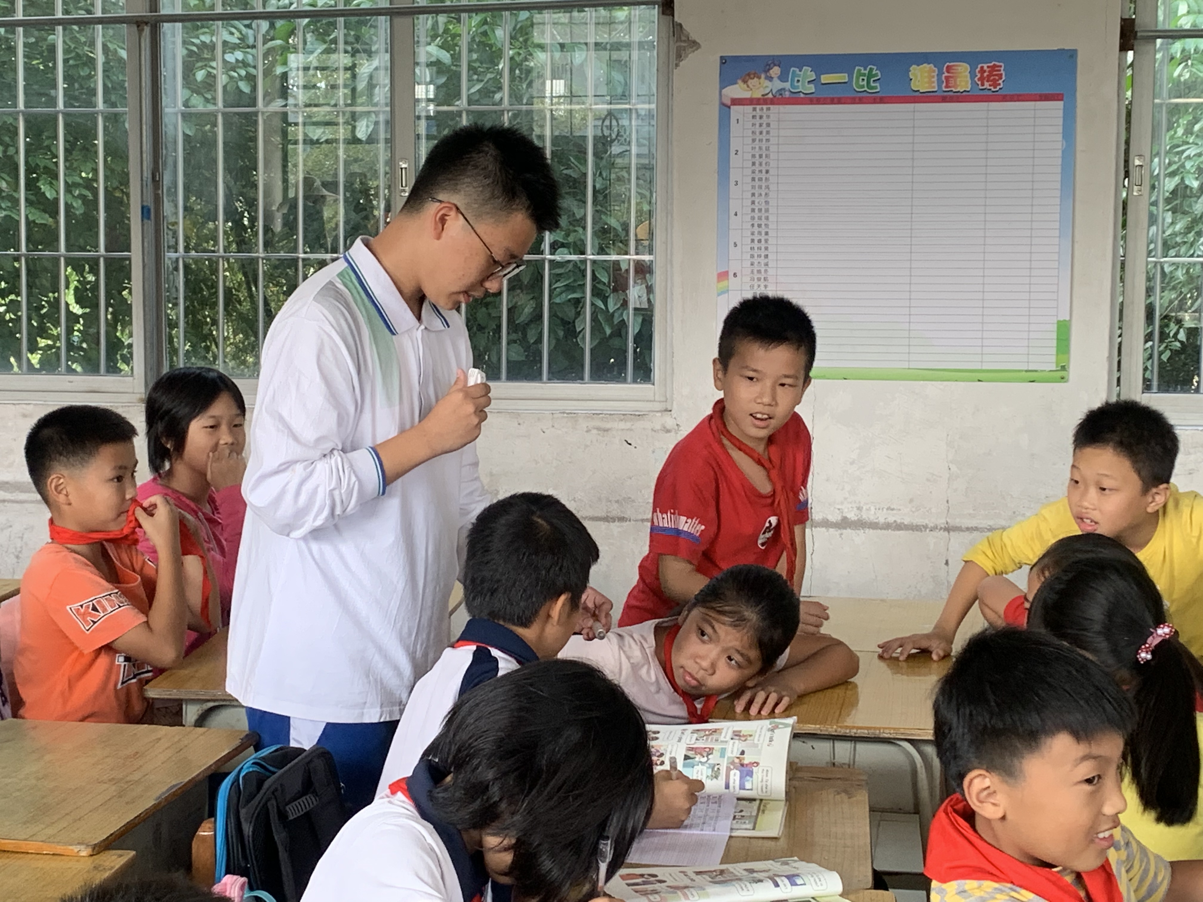 “大家观察一下我手中的瓢虫。”在当地的富勤三小,高二10班学生蒋官语正在给四年级学生上一节主题为“感悟生命”的科学课,他为这节课准备了近半个月。“为什么蜻蜓是益虫?”“因为吃蚊子!”一问一答,课堂气氛十分活跃,孩子们听得入神。“我们是先以昆虫为引子,介绍身边的生命现象,再讲到宏大的话题,如疫情。”蒋官语说,“这里的孩子有很多亲近自然的机会,所以我想教他们更多关于昆虫的知识,加深他们和自然的羁绊,说不定可以培养他们的兴趣,做更深入的研究”。