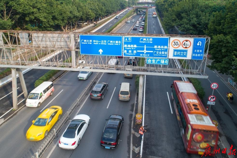 一大早,在广州大道上客村立交三层的匝道,有市政施工人员指挥引导车辆驶上三层转盘环岛,龙门架上也安装了大型车换到绕行的交通标示牌。