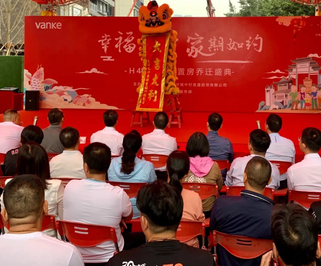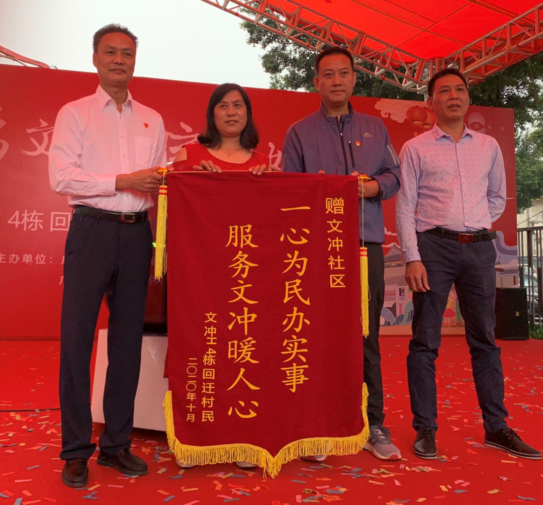 在H4栋回迁安置房乔迁盛典现场,心怀喜悦的回迁村民代表,还向文冲社区赠送了一面书有“一心为民办实事 服务文冲暖人心”的锦旗致谢。