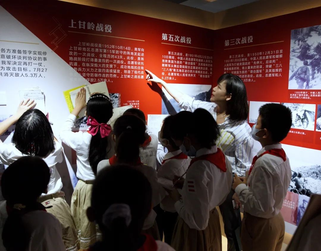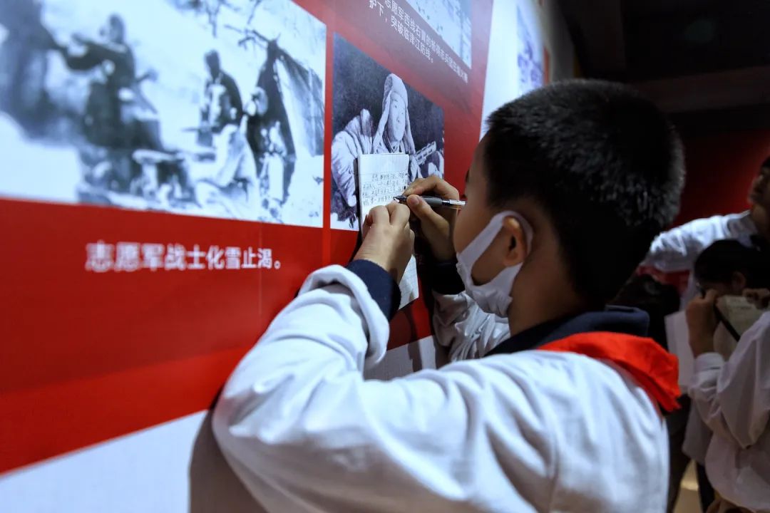 活动上,学生们除了观看展览主办方特别拍摄的纪念视频外,还在工作人员的带领下,重新走回70年前,那炮火连天的异国战场。