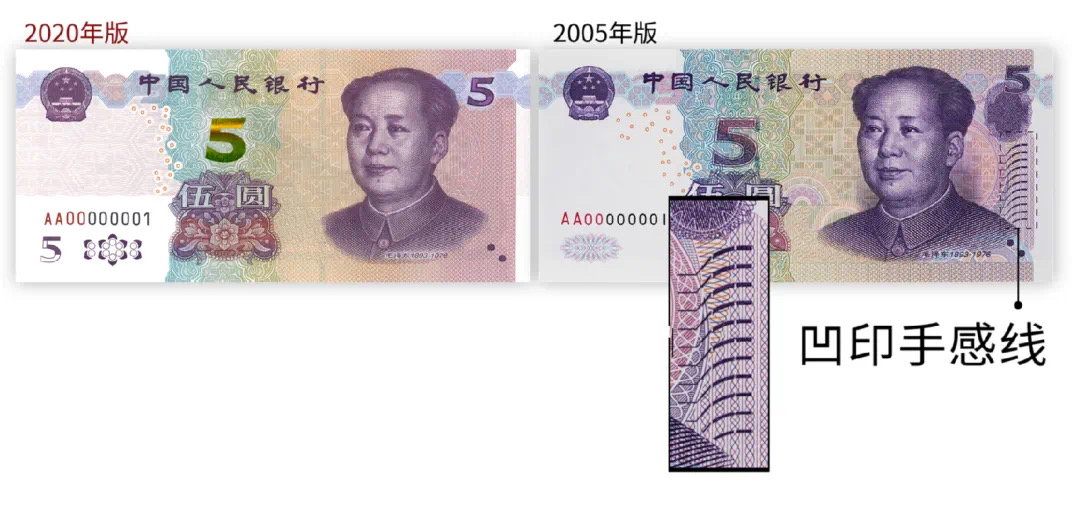 与现行2005年版第五套人民币5元纸币相比,2020年版第五套人民币5元纸币的防伪技术和印制质量在多个方面进行了提升。