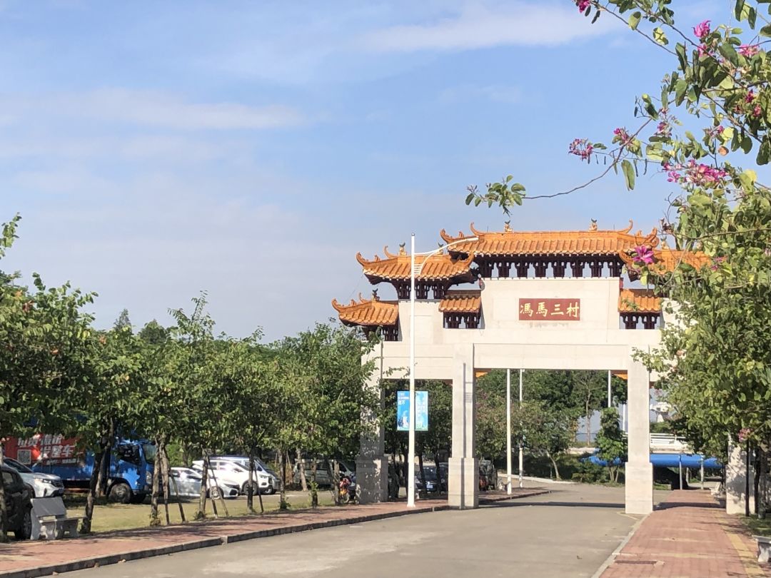 横沥镇冯马三村的牌坊就坐落在村口。进村的路,葱葱郁郁,路面平整、干净。