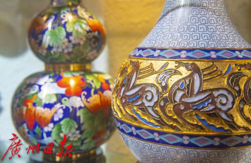 “很多人知道景泰蓝,却不知广州珐琅。广州珐琅工艺包括掐丝珐琅、画珐琅、錾胎珐琅、透明珐琅等。景泰蓝是铜胚掐丝珐琅,是其中的一种。”杨志峰拿起桌上一个凹凸不平的铜壶解释,掐丝是指用铜丝掐成各种图案,粘在铜胎上形成的纹路。