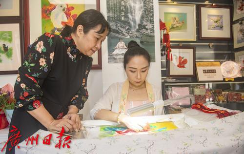 广绣传承人李敏在指导女儿谭靖榆完成一幅广绣作品。 |