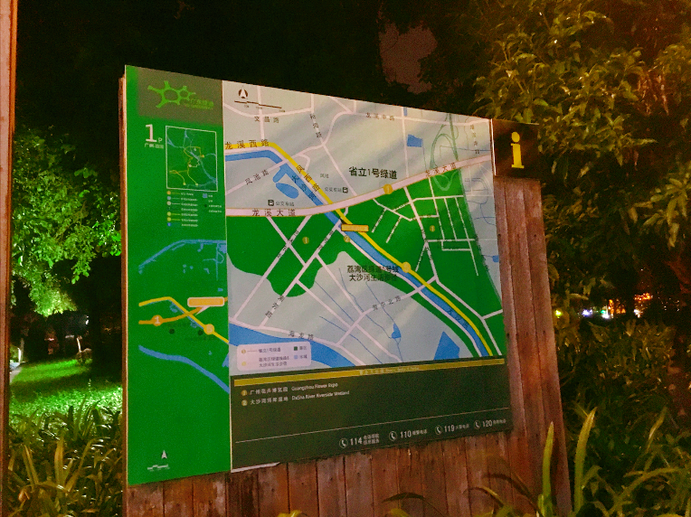 除了大坦沙岛外,大沙河湿地公园的灯光工程也迎来了升级。大沙河湿地公园属于广州市荔湾区水秀花香生态区规划的五个生态区之一,在广州亚运会期间落成。大沙河全长5.2公里,南北走向,其中的1.6公里河段穿过位于海龙街的广州花卉博览园,两岸近3000亩地都被花卉环绕,散落分布的湿地小岛,是广州城内难得一见的生态景观,已成为附近街坊日常散步乘凉的好去处。
