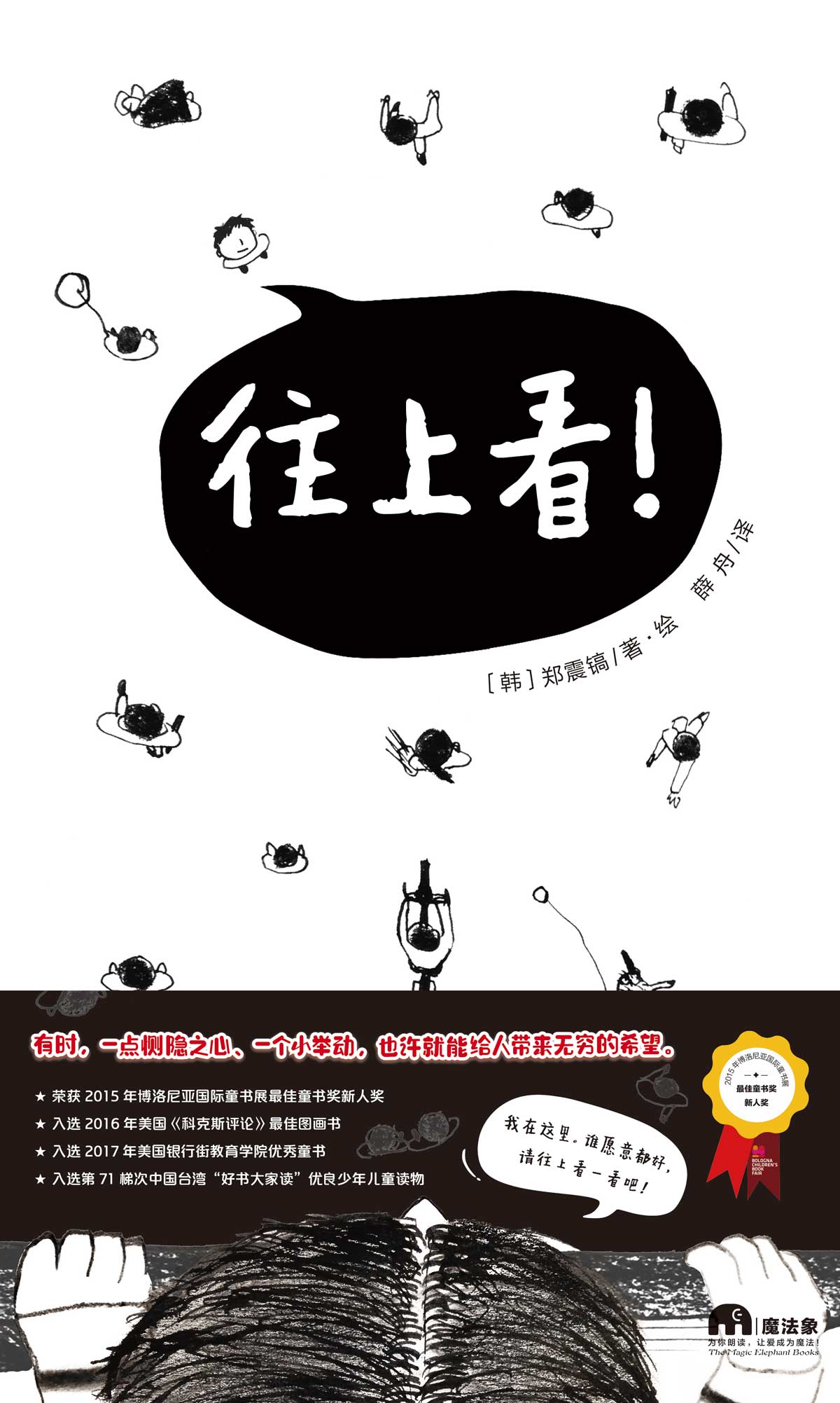 著绘者:〔韩〕郑震镐,韩国图画书作家、插画家。曾就读于韩国汉阳大学建筑系。小时候,几乎每天都在医院里度过,童话成了陪伴在他身边的朋友。现在则用画笔建造故事,作为送给孩子们的礼物。已经出版多部图画书,并获得多项国际大奖。其中,《往上看!》荣获2015年意大利博洛尼亚国际童书展最佳童书奖新人奖,并入选2016年美国《科克斯评论》最佳图画书。