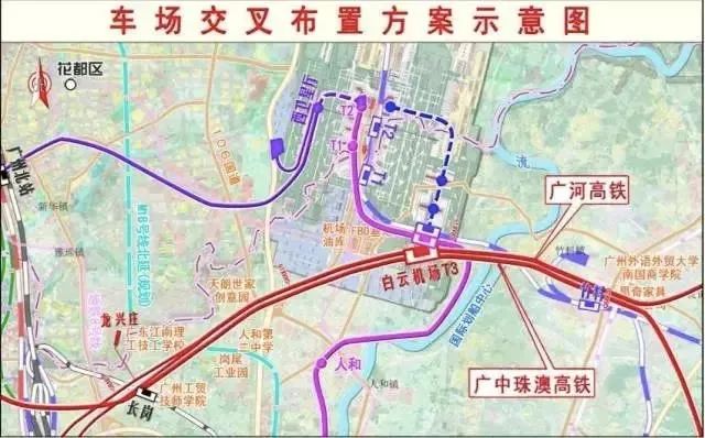 根据省发改委发布的《广州白云国际机场综合交通枢纽整体交通规划(修编)》,规划在白云机场T3站正线引入广河高铁。而在近日公布的《白云机场三期扩建轨道交通配套工程可研编制及勘察设计》中,广河高铁有望在知识城北(红卫地铁站)设站。