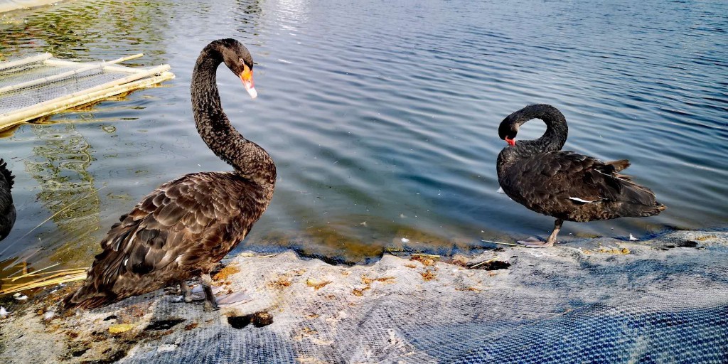 小湖中驚現黑天鵝,一隻兩隻三隻四隻……不少遊客正在悠閑垂釣 。