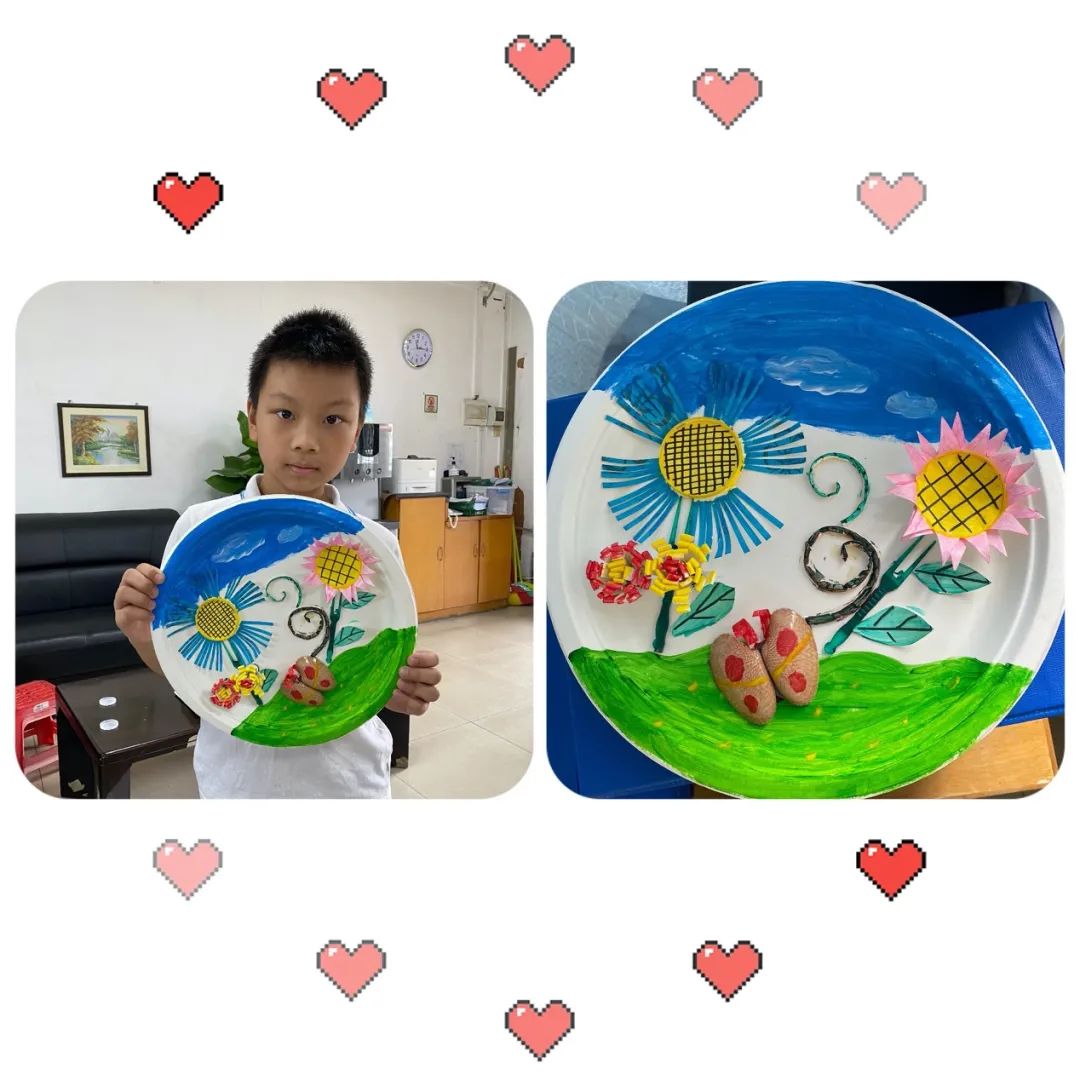 作品介绍:作品使用废弃的纸盘子做底板,把使用过的一次性纸杯改装成花朵、叶子和花藤;中秋节剩下的月饼叉子涂上颜色就变身为花朵的茎;还有餐桌上看似无用的花甲壳,涂上花纹加上触角就是一只美丽的蝴蝶。在底板上画上蓝天白云,还有青草红花,小小的纸盘里装着让人心旷神怡的花花世界。让人仿佛置身于花香满天的大自然中。