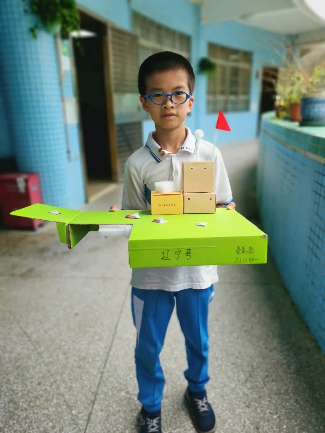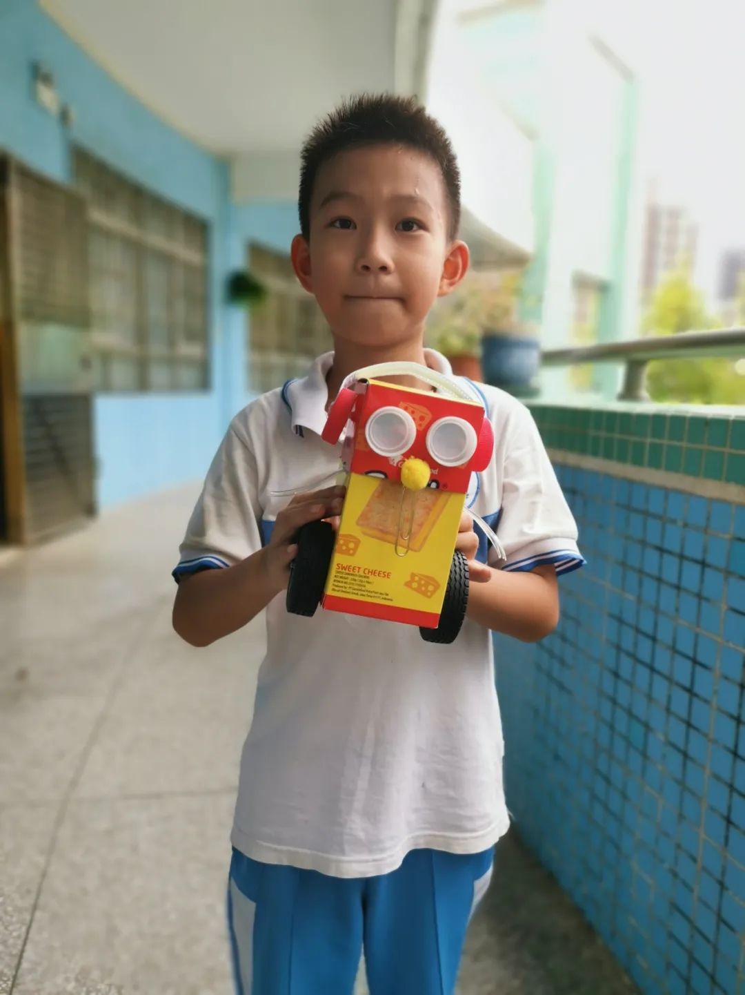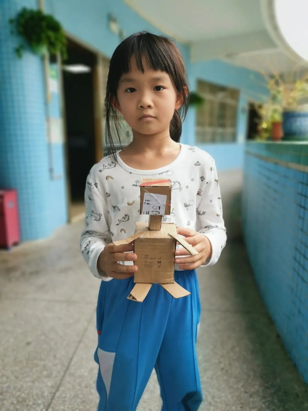 作品介绍:这是我亲手制作的第一个机器人。原来废弃的纸箱只要通过简单的改造也可以摇身一变,变成我喜欢的玩偶。下次我还要试试让机器人说话、唱歌、走路。