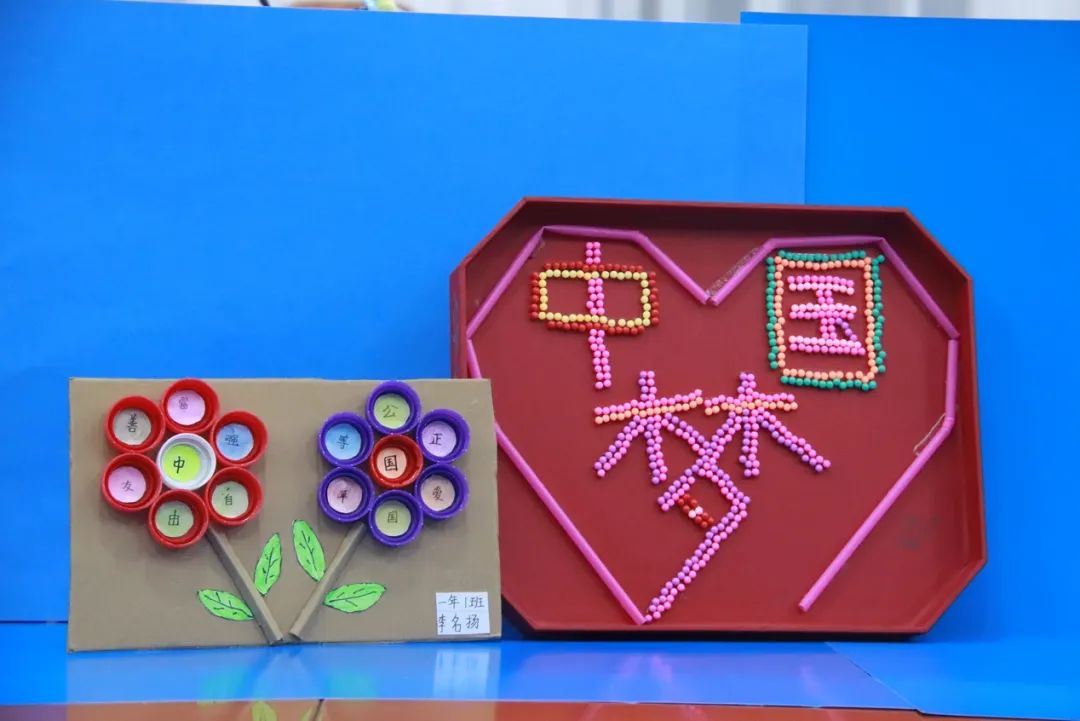 作品介绍:《中国梦》组合作品主要用废弃的塑料瓶盖、吸管、豆子、纸皮、月饼盒盖子等制作而成。在塑料瓶盖中写上了社会主义核心价值观,用豆子和吸管组合成“中国梦”的字样,意在通过丰富多彩的图案让大家明白实现中国梦需要我们共同的努力,就像图中的豆子一样,一起共同筑造而成。