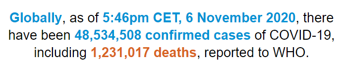 根据世卫组织最新实时统计数据,截至欧洲中部时间11月6日17时46分(北京时间11月7日0时46分),全球累计新冠肺炎确诊病例48534508例,累计死亡病例1231017例。
