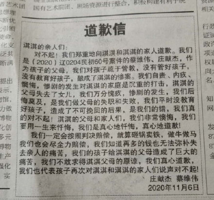 大连13岁男孩蔡某某杀害10岁女孩王某一案有了最新进展。11月6日,蔡某某父母于当日在《大连日报》对其登报道歉。详情>>>