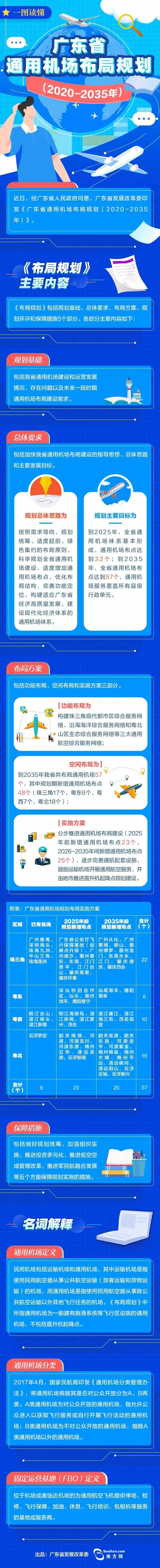 按照规划,要分步推进新建通用机场。2025年前,新增23个通用机场布点,包括新增广州南沙、东莞、肇庆高要、肇庆怀集、惠州惠东、江门恩平、江门台山、汕头、潮州饶平、揭阳普宁、深汕特别合作区、茂名、湛江徐闻、湛江雷州、阳江海陵岛、韶关南雄、河源、河源龙川、河源东源、梅州五华、清远英德、云浮郁南等22个通用机场布点,升级扩建广东省公安厅飞行保障基地为通用机场。迁建深圳南头直升机场、湛江坡头通用机场。