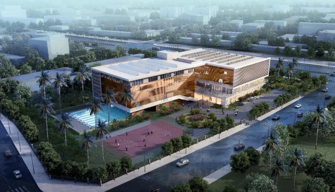 在居民体育馆建筑结构的设计上,还融入了岭南特色建筑——骑楼元素,吸收骑楼天井的设计灵感,增加了建筑空间的层次和建筑的通透感。外立面采用的棕红色穿孔铝板幕墙,通过孔径大小和板材颜色深浅的变化,凸显运动的动感和韵律,赋予居民体育馆青春的活力和全新的动力,传达全民健身的健康理念。