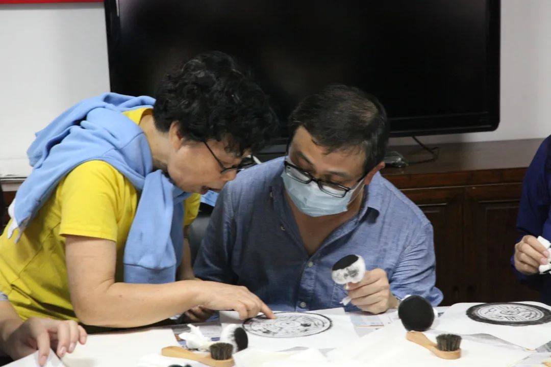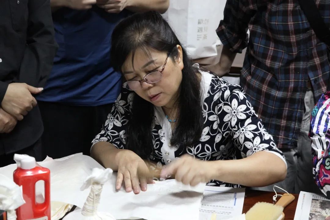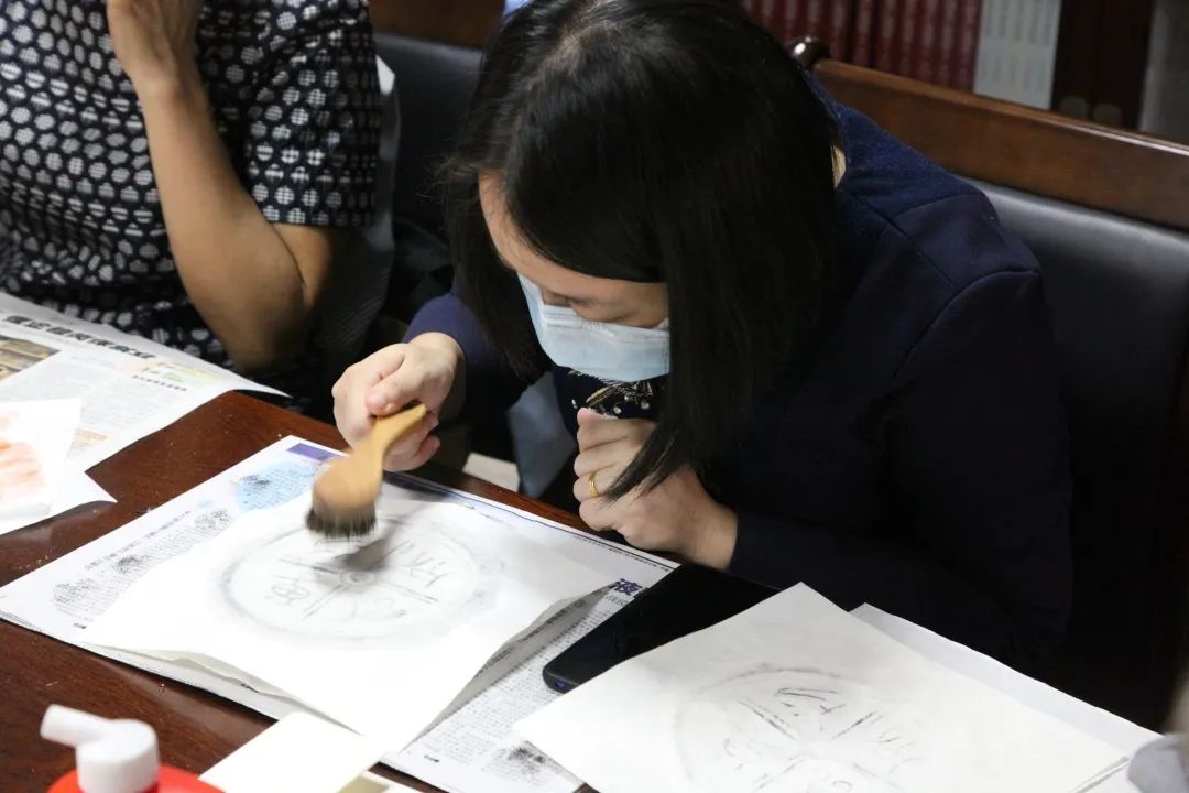 在知悉了拓片对留存珍贵历史资料所具有的重要作用与意义后,参与活动的人员在陈玉兰、杜霭华两位老师的带领下,体验了一次制作拓片的过程。两位老师一边动手示范、一边讲解每个步骤的操作重点,指导参与者们在石刻上进行拓印的方法。